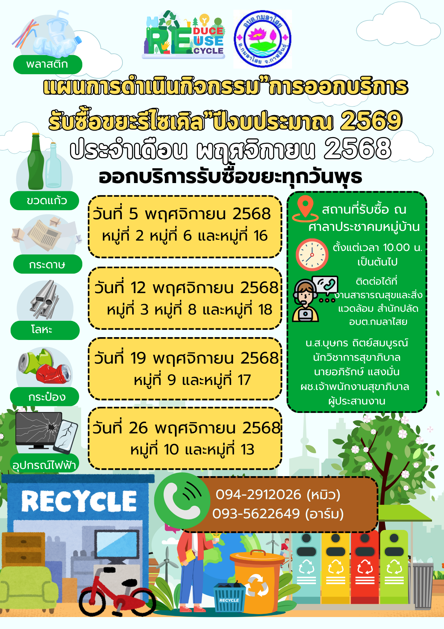 ประชาสัมพันธุ์ แผนการดำเนินกิจกรรม การออกบริการรับซื้อขยะรีไซเคิล ประจำเดือน พฤศจิกายน 2568 [20 ตุลาคม 2568]
