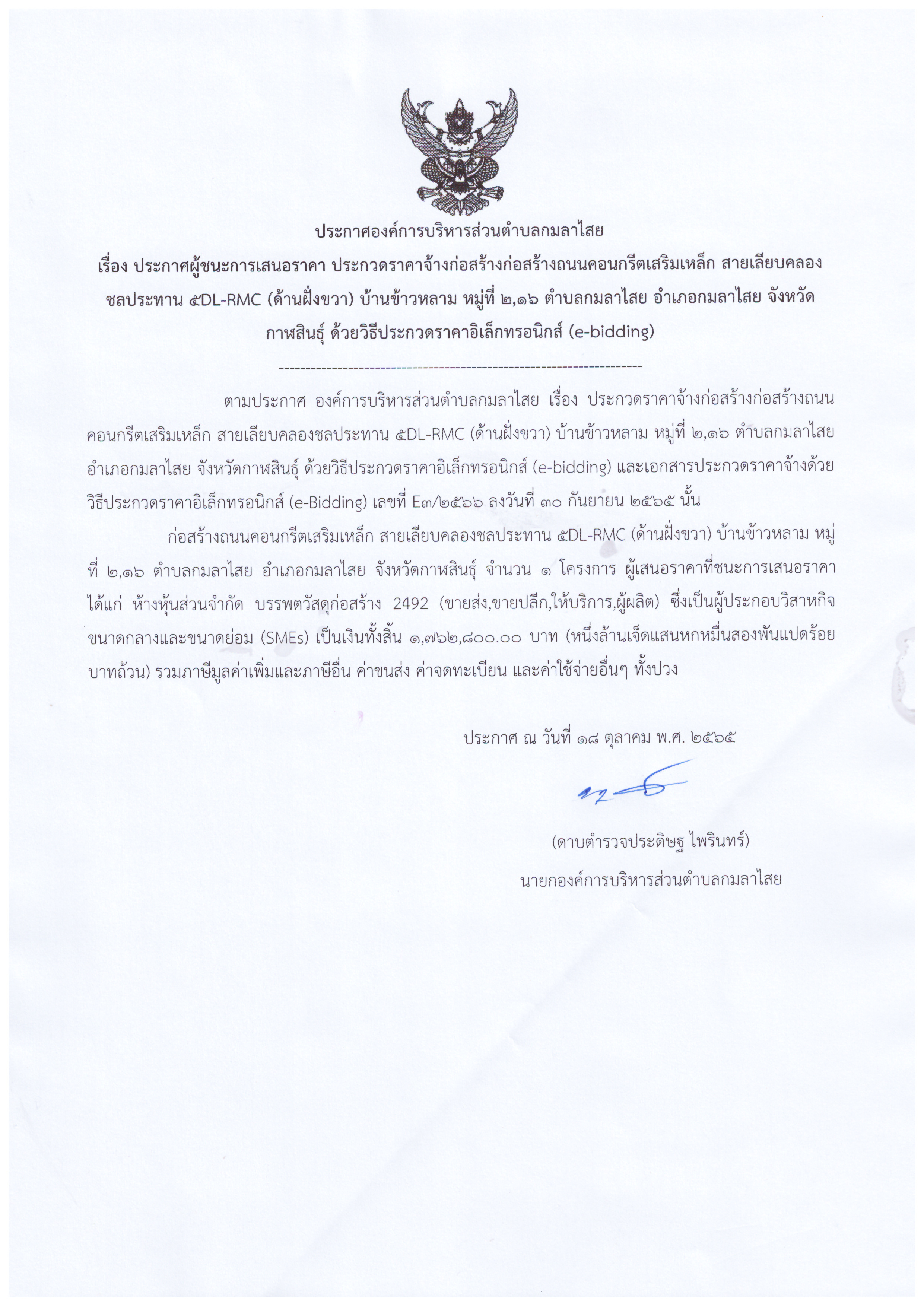 ประกาศผู้ชนะการเสนอราคา จ้างเหมาก่อสร้างถนนคอนกรีตเสริมเหล็ก สายเลียบคลองชลประทาน ๕DL-RMC ( ด้านฝั่งขวา ) บ้านข้าวหลาม หมู่ 2,16